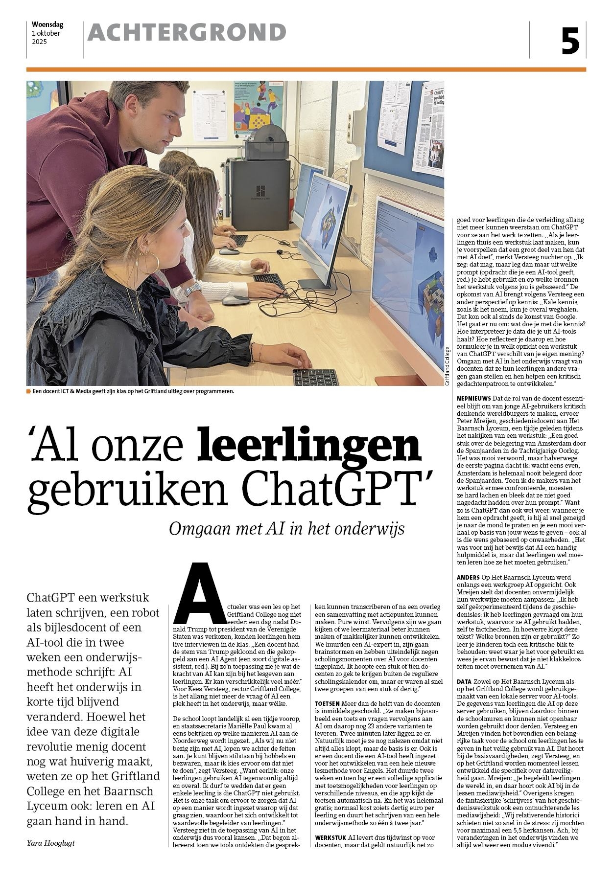 In bijgaand interview met rector Versteeg, uit de Soester Courant d.d. 1 oktober, lees je meer over welke plek AI heeft in ons onderwijs. Kees Versteeg: “Het is onze taak om ervoor te zorgen dat AI op een manier wordt ingezet waarop wij dat graag zien, waardoor het zich ontwikkelt tot waardevolle begeleider van leerlingen.” Het Griftland ziet in de toepassing van AI in het onderwijs vooral kansen.